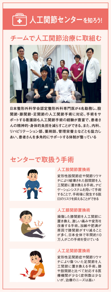 「股関節・膝関節・足関節は日常動作を支える重要な関節で、そこに痛みを抱えることは健康寿命に直結します。当院では、地域の皆様に長く健康に暮らしていただけるよう、専門医を結集して人工関節センターを開設しました。股、膝に加えて、専門とする医師が少ない足関節の治療にも対応しているため、痛みにお困りの方はご相談いただければと思います」と、細野院長はセンター開設への思いを語ってくれた。
