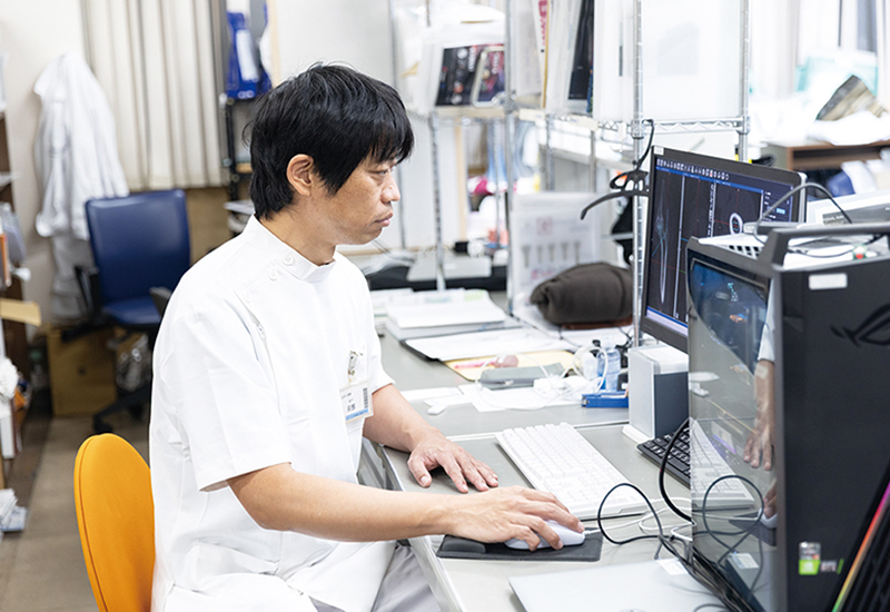 CTデータをナビゲーションシステムに取込み、患者さんに合わせた三次元術前計画を立てる阿部先生。この手順を行うことで、より正確な手術を行うことが可能になる